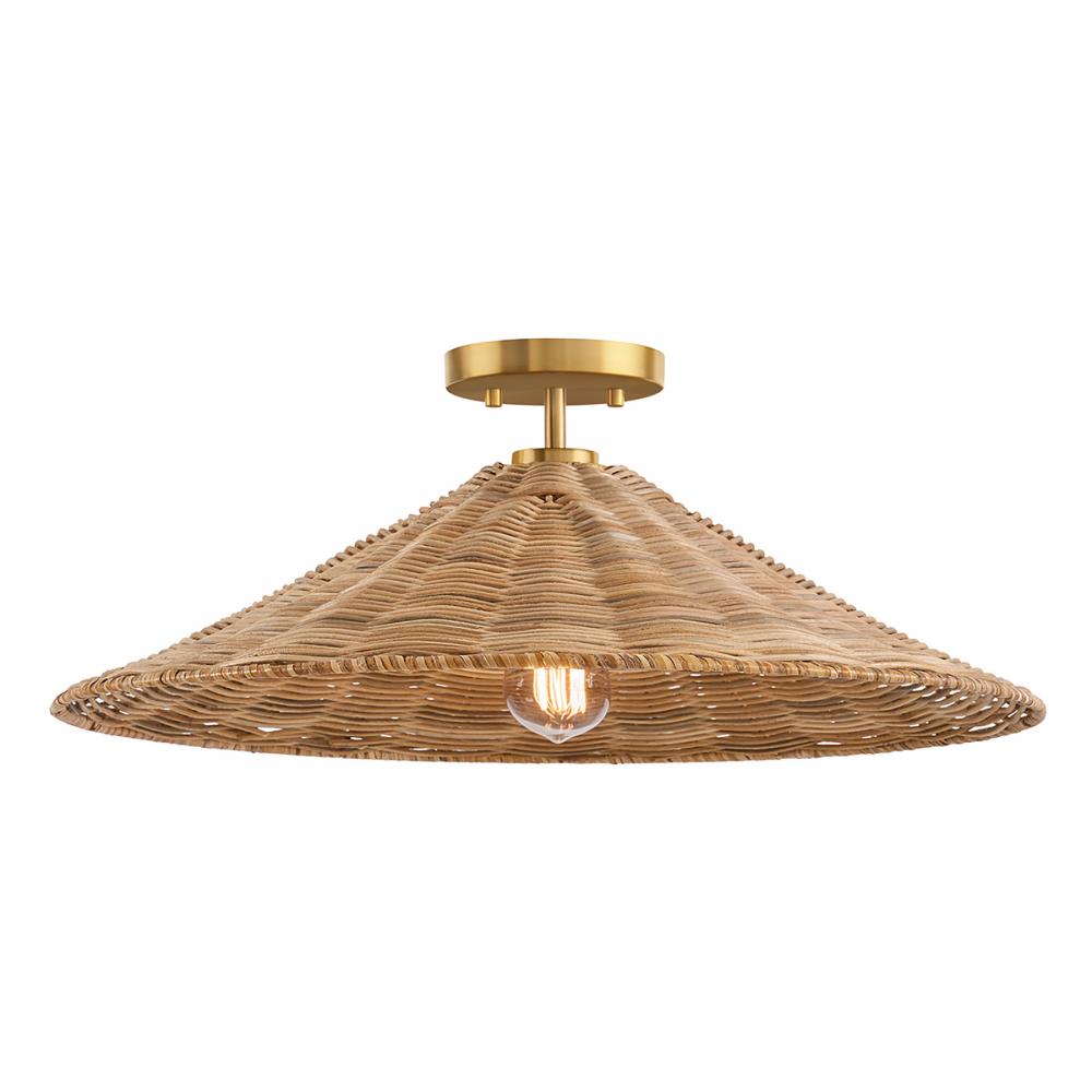 Add a relaxed, natural vibe to any room with this chic 1-light ceiling light. It flaunts a highly textured shade of natural rattan paired with a Natural Brass finish, bringing in a bold and fashionable flair. 8" height and 22" width. Uses one standard size bulb, max 60 watts. LED bulb compatible. Damp area rated.
