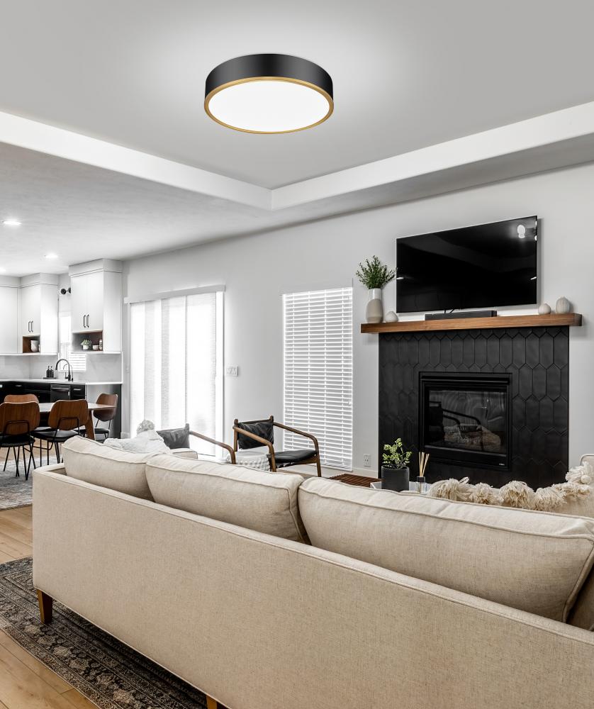 Fall in love with the sophisticated look and modern technology featured in this contemporary flush mount LED ceiling light. Its energy efficient and dimmable, complete with selectable light color and a frosted diffuser for excellent ambiance. The steel frame of the fixture features a matte black finish with modern gold finish accent banding, creating a warm, soft touch of contrast and dimensionality.