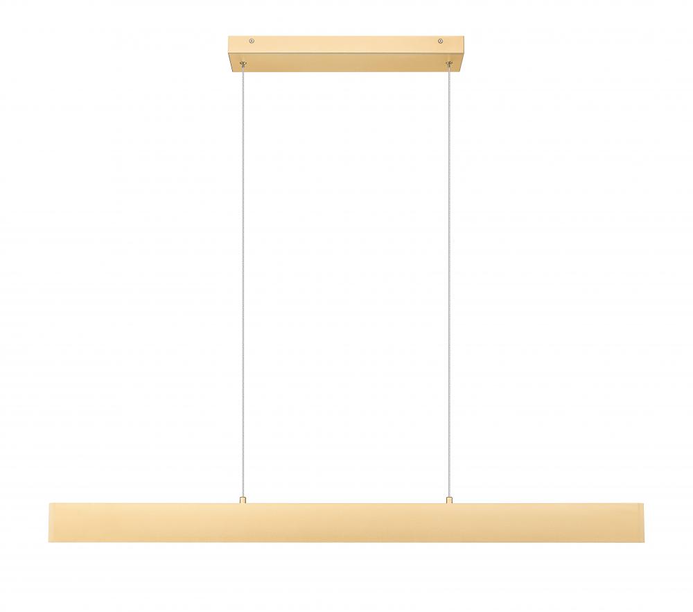 A minimalist motif shows sophistication in a single-light linear chandelier with a chic gold finish over metal construction tones up a subtle parallel arrangement. Highlight islands and other horizontal venues with this energy-saving LED fixture with dimming features and switchable light color levels.