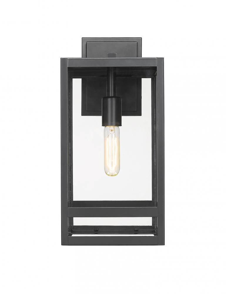 Perfect proportions reflect a crisp linear silhouette and design turning the Nuri one-light outdoor wall sconce into a tasteful d?cor element repurposed for exterior spaces. Embellish a structure or home space with this elegant light featuring construction of black finish steel in a pieced and layered format. Clear glass panels keep the focus on dramatic geometric lines.