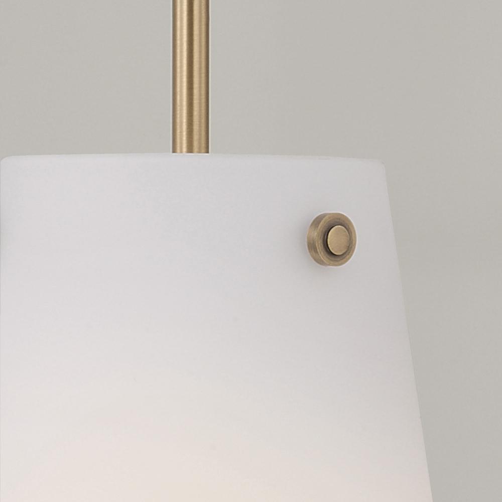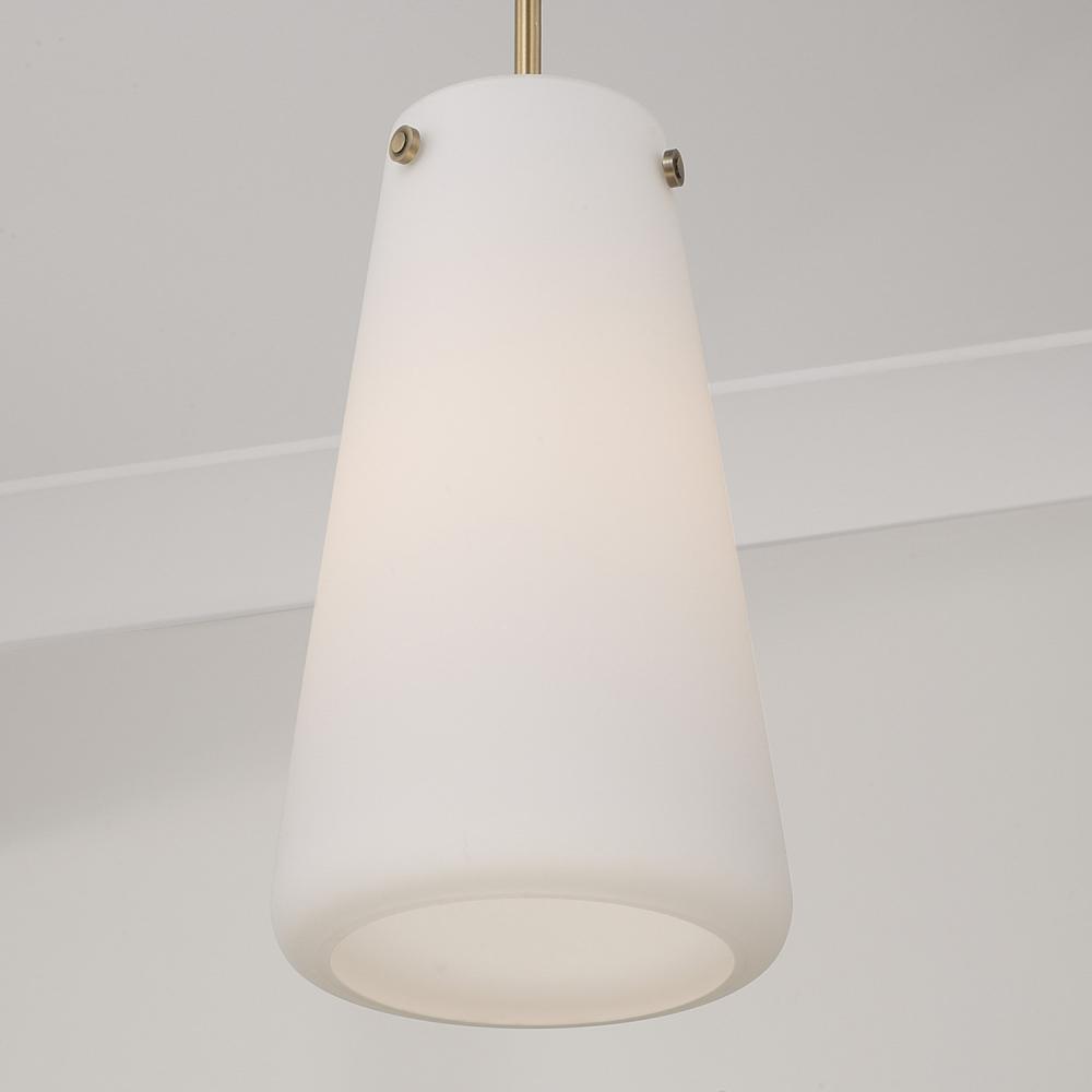 The Averitt Pendant delivers elegant transitional style with grand scale. The exposed rivet details and unique rounded, recessed bottom add high design to the elongated Soft White glass tapered shade, while the Aged Brass finish creates subtle shine and sophistication.