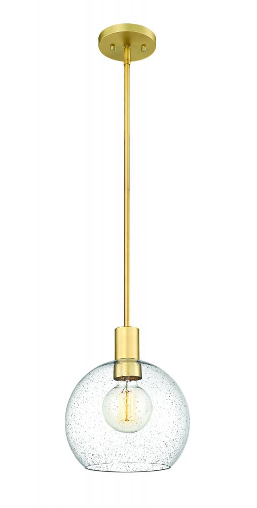 A handmade-inspired artisan quality presents itself in the clear seedy glass globe of this Mid-Century Modern light pendant. Creating a gorgeous illumination across spacious kitchen islands and gathering spaces, this welcoming, classically designed single light pendant also offers a luxe metallic touch with its warm olde brass finish steel suspension rod and round disc-shaped plate mount. The orb-like globe, with its Arts and Crafts era seedy glass design, also gives off a subtle texture and scintillation across tablescapes.