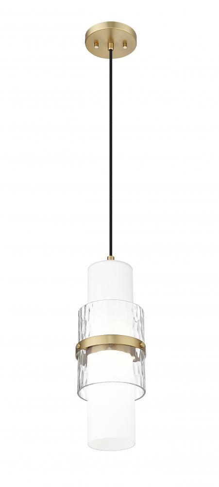 Chic in modern gold, this modern one-light pendant is a decorative addition that brings sophisticated energy in any living or dining space. Superbly designed, it centers on a cylinder of etched opal glass that diffuses light beautifully and is augmented with a shorter cylinder of textured clear glass and a decorative cuff in a matching finish. Simply stunning in series over a kitchen island or alone in your den or living room.
