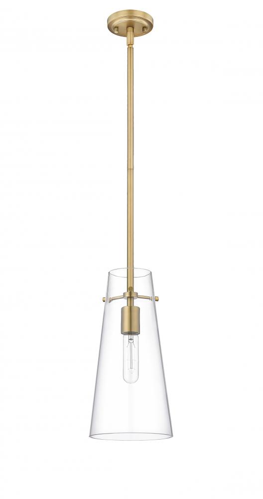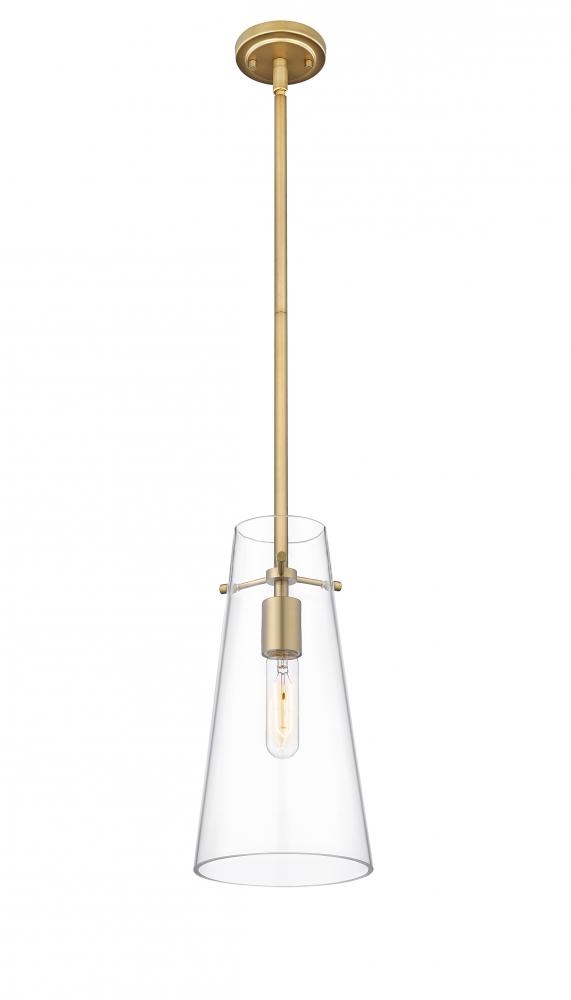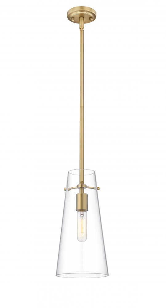 Minimalist design credentials are on full display in a modern one-light pendant. Pairing a cone of clear glass with a simple housing and suspension, the pendant is a gorgeous choice with understated elegance. Modern gold finish is a sleek touch, offering a refined look and feel in your kitchen or living area.