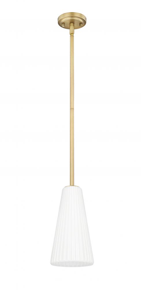 Embrace the elegant warmth of a sophisticated modern gold finish in this contemporary one-light pendant. Its flared silhouette is established with fluted, frosted glass that shades the light to deliver inviting, diffused illumination in any setting. Clean lines define the design, while delicate fluting adds the perfect touch of movement and fluidity.