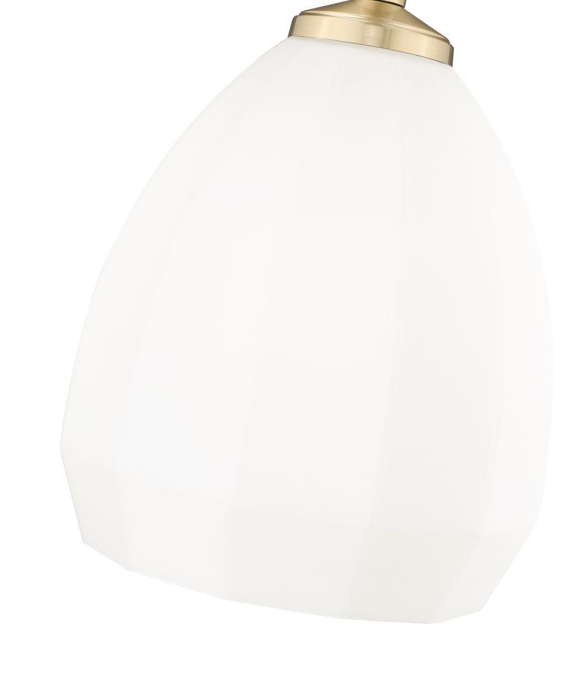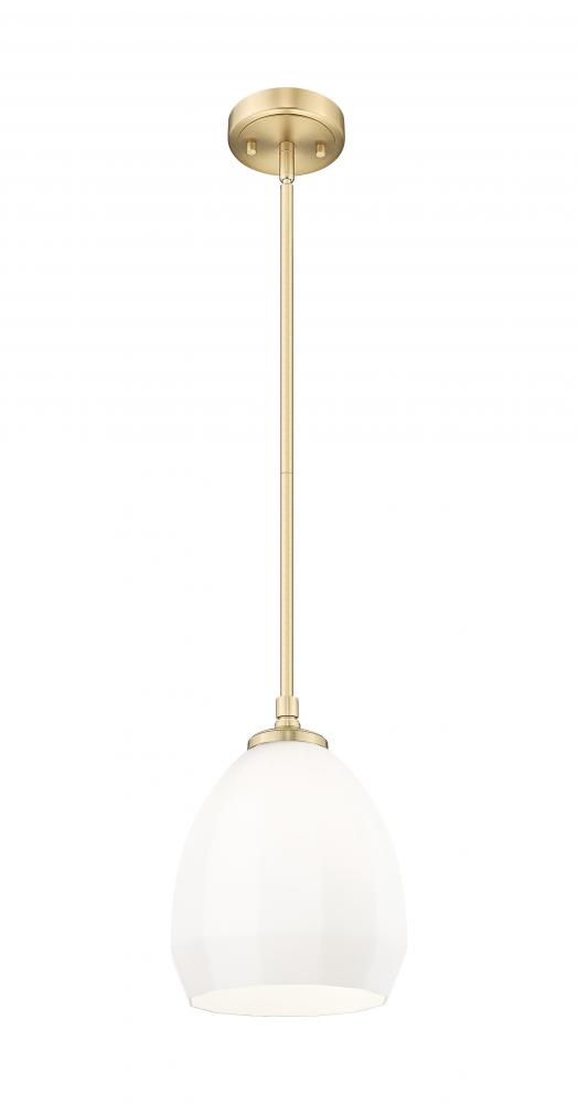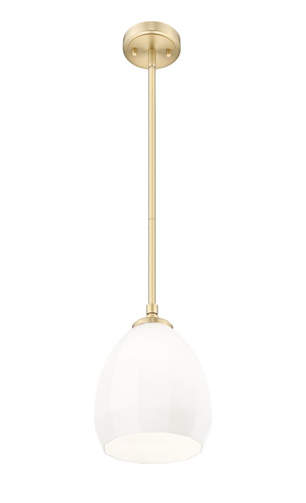 Delicate shaping perfectly enhances the domed profile of a modern classic one-light pendant thats perfect for your inviting home. Its modern gold finish plays up vintage character and warmth, while a matte opal glass shade is clean and refined to deliver beautiful illumination.