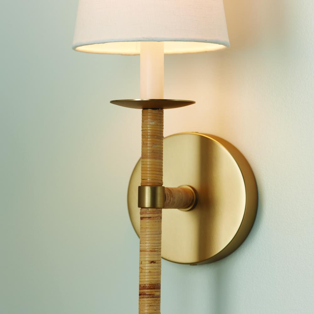 6"W x 18"H 1-Light Sconce in Matte Brass with Hand-Wrapped Natural Rattan and White Fabric Stay-Straight Shade