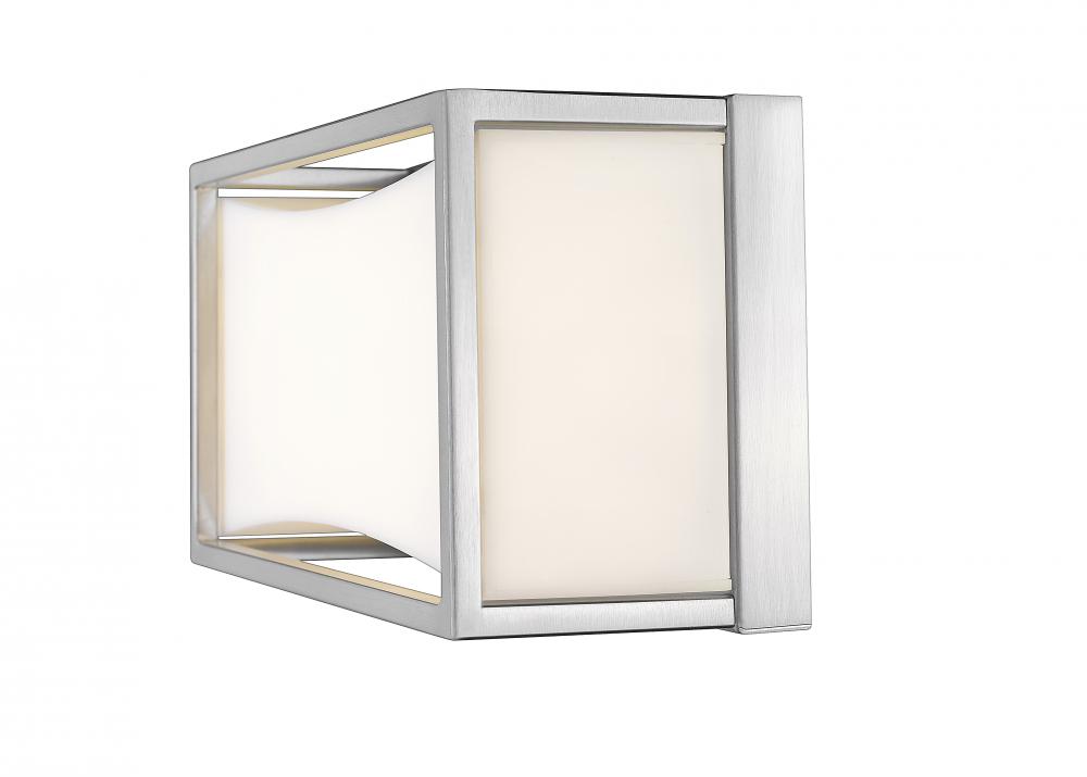 Sleek, gleaming lines of brushed nickel finish metal give this one-light vanity light a clean, modern look. Perfect for a powder room, it boasts a delicate, frosted white shade that diffuses the light into a soft, graceful glow.