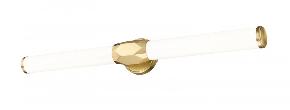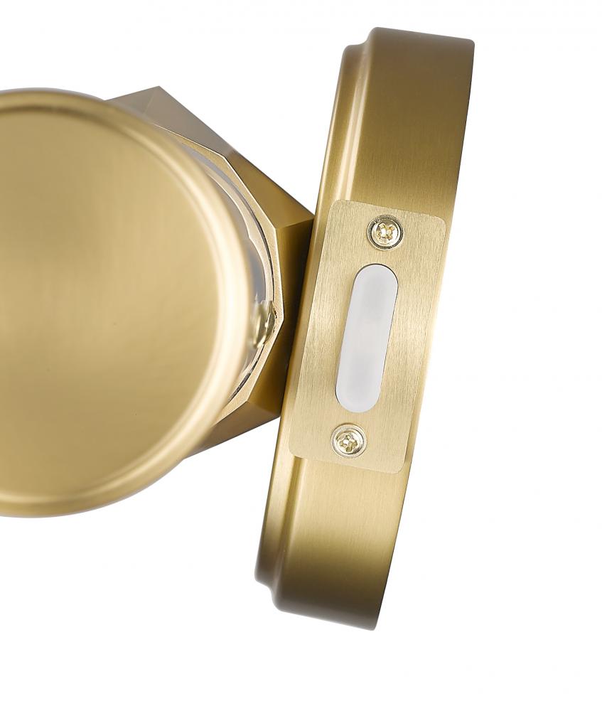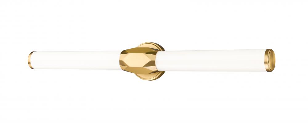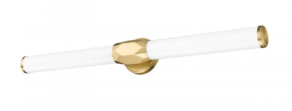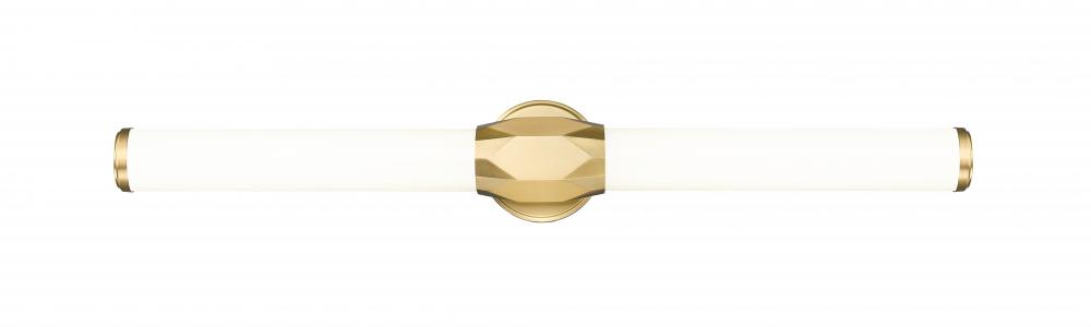 Chic design accents and a crisp linear design enhance this one-light vanity light, a great choice for a variety of bath spaces. Aluminum framing with a warm modern gold finish includes end caps and a prism-inspired holder, furthering the rich geometric and complete package of a light fixture with optional color temperature values.