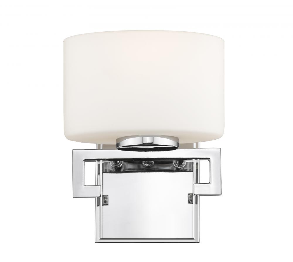 A scintillating blend of shiny chrome and matte opal glass creates a dynamic look for transitional bath spaces. With a geometric profile and enticing design, this one-light vanity adds a bonus feature with long-life integrated LED technology.