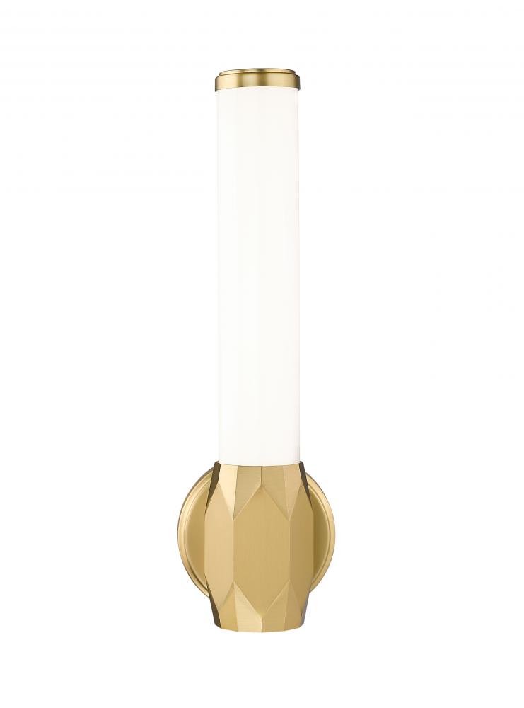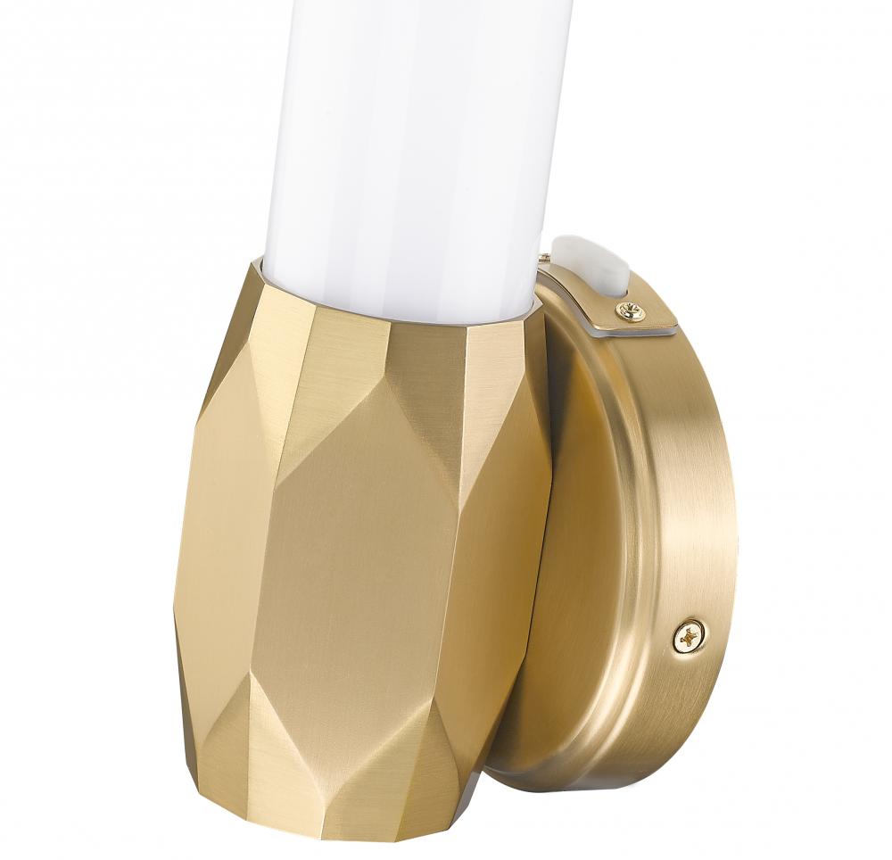 Illuminate bathrooms and living spaces with this elegant one-light wall sconce. With a chic modern gold finish aluminum frame including diffuser end caps and a prism-inspired center holder, its Art Deco influence shows through to soften any living space.