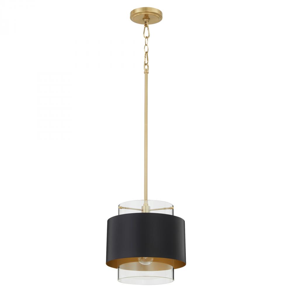 This stylish pendant features a crystal-clear glass drum shade with a duo-tone matte black, aged brass collar. The subtle warmth of aged brass peeks through the clear glass and balances its black exterior. These decorative lights are suspended from aged brass rods with adjustable chains that connect to a circular mounting plate. Hang in multiples at staggering heights or singly over a conversational space. Available in 10" or 12" diameters.