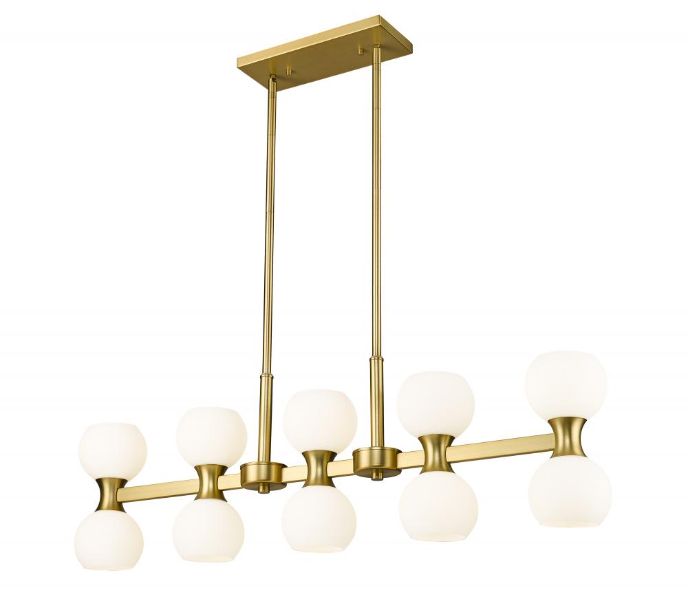 Add a dose of Mid-Century Modern charm to a custom space with this 10-light kitchen island light from the Artemis collection. Linear elements juxtapose with artisanal rounded shapes in a transitional fixture with gorgeous finish effects. This island light features modern gold finish steel framing and opal shades illuminating light both upward and downward, adding function and fashion to kitchens, living areas, and entertaining spaces.