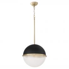 This eclectic one-light pendant is the perfect lighting solution for any modern industrial or nostalgic transitional space. A two-tone spherical shade with a studio white cap and milky glass base is divided by a vintage-inspired capture ring. Decorative screws pair with a matching aged brass chain and stem hanging system to complete the look.