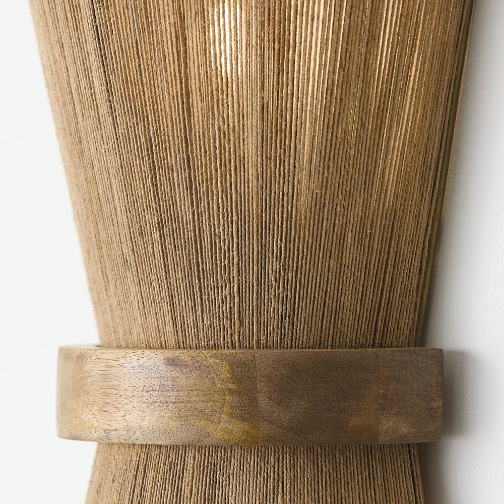 Earthy and elegant with a classic hourglass silhouette, the Maya Sconce uses natural materials to enhance any space. The combination of Light stained mango wood and hand-wrapped Natural Jute Rope creates high design with artisan appeal, while the Matte Brass finish adds a touch of shine.