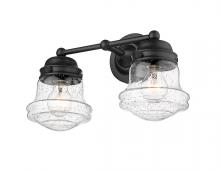 Charming, festive style goes light as it lights up a bath space with this two-light vanity from the Vaughn collection. Illuminate a compact vanity with a themed fixture borrowing from nautical and industrial, formed of cool brushed nickel finish steel and featuring unique schoolhouse clear seedy glass shades. This light becomes a central focus in a transitional or modern bathroom.