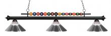 Playful pool ball motifs best describe this beautiful three light fixture. Finished in Brushed Nickel and paired with Clear Ribbed Glass and Metal Brushed Nickel shades, this three light fixture would be at home in the game room. 72 inches of chain per side is included to ensure the perfect hanging height.