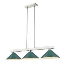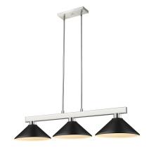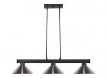 Straight line inspired detailing defines this beautiful three light fixture. Finished in brushed nickel and paired with metal brushed nickel shades, this three light fixture would be equally at home in the game room, or anywhere else in the house needing a touch of modern charm. Adjustable rods are included to ensure the perfect hanging height.