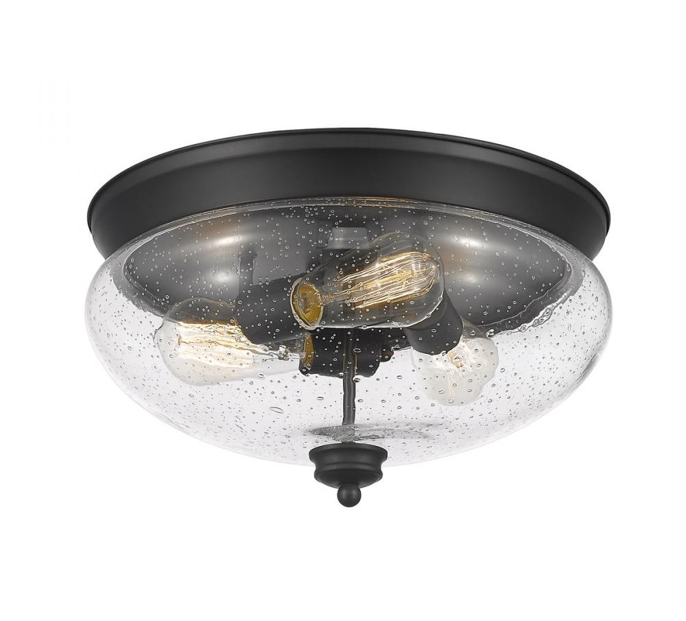 Oblate glass shades influenced by the school house globes of old, the Amon flush mount collection puts a contemporary spin on a traditional classic. Vintage inspired Seedy Glass or Matte Opal shades are paired with an updated Matte Black finish to create a