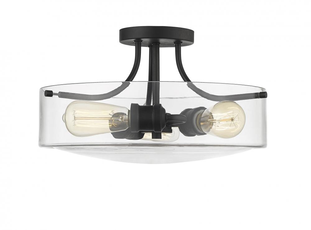 Play up an industrial motif with this charming three-light semi-flushmount ceiling light. Crafted in matte black with a clear glass shade, this stylish fixture is a wonderful update in a bedroom or home office.