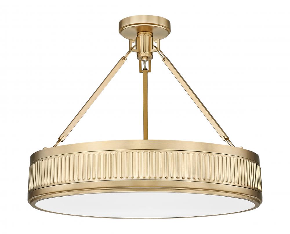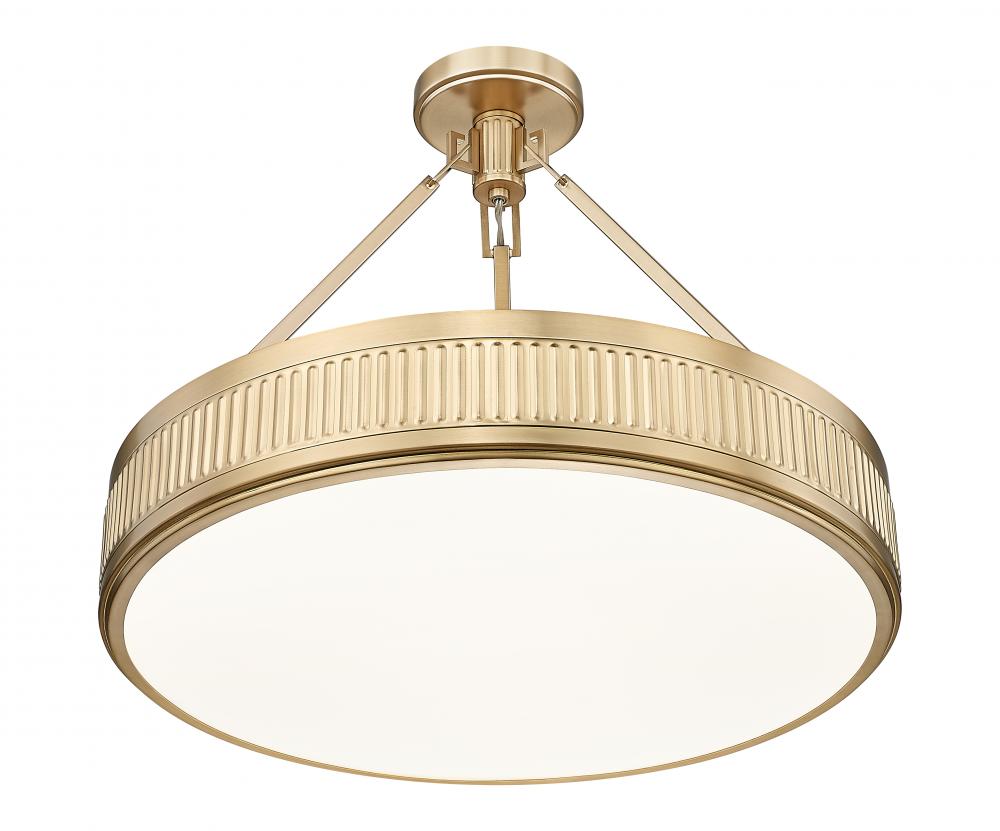 Capture mid-century design aesthetics with the intriguing textured band details featured on this modern three-light semi-flush mount ceiling light. Beautiful over a living room seating group or chic bedroom, it offers an opaque diffuser and a rich, warm modern gold finish for wonderful ambiance. This fixture is equipped with a Z-Lite EZ change LED module that offers energy efficiency, light color selectability, and dimming capabilities.