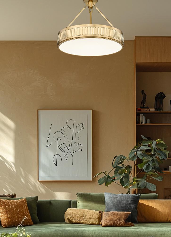 Midcentury Modern fans will be delighted by the Quinn collection with its fluted banding that adds textural interest to the classic, shallow drum shape. Available in two sizes pendant and two sizes semi-flush mount to accommodate almost any room setting an