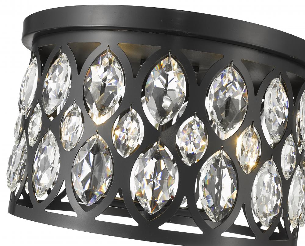 Exquisite and glamorous, this four-light contemporary flush mount ceiling light from the Dealey collection is the perfect addition to a Hollywood Regency style home foyer or hallway between rooms. Featuring a matte black steel shade, complete with striking ellipse-shaped cut outs with glimmering clear crystal pendants, this flush mount light lends a dramatic, contrasting look. With three candelabras set behind the crystals, this low profile fixture also creates a charming fractalized illumination along the walls and footpath.