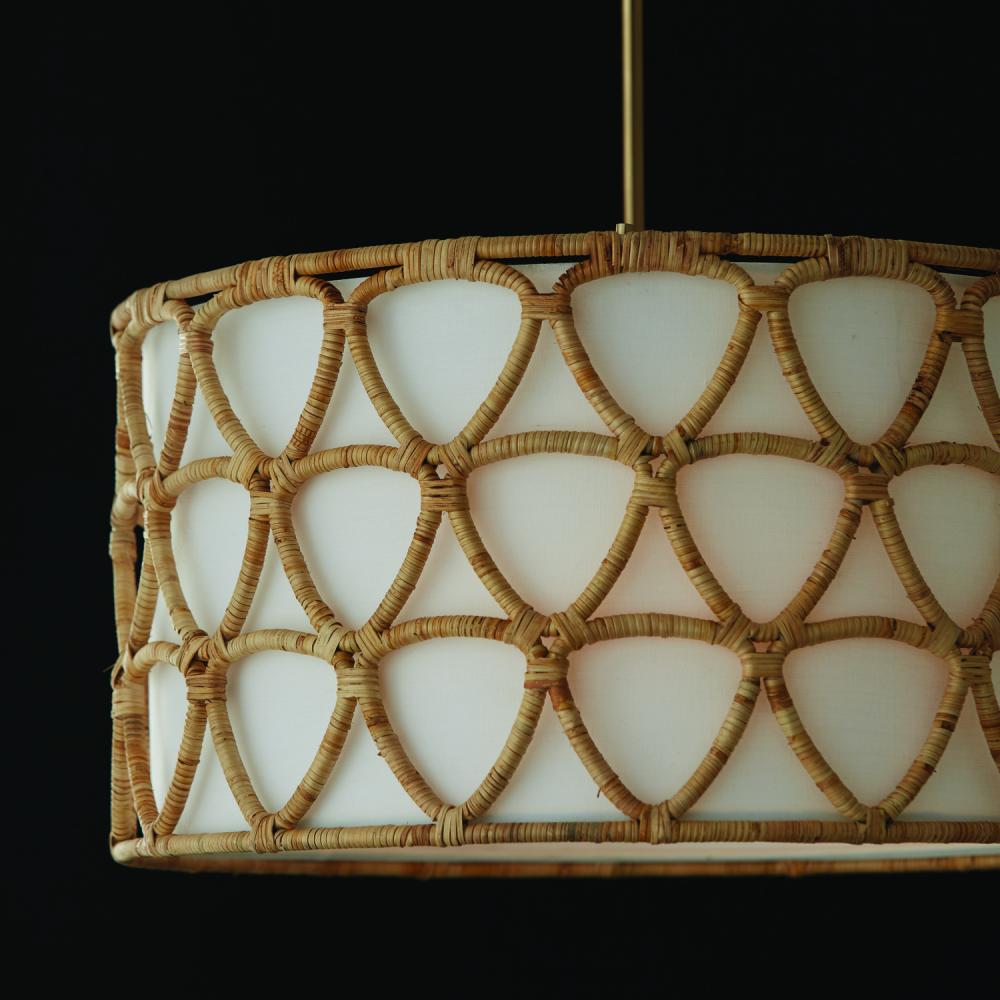 24.5"W x 24"H 4-Light Pendant in Matte Brass with White Fabric Shade and Hand-Wrapped Natural Rattan