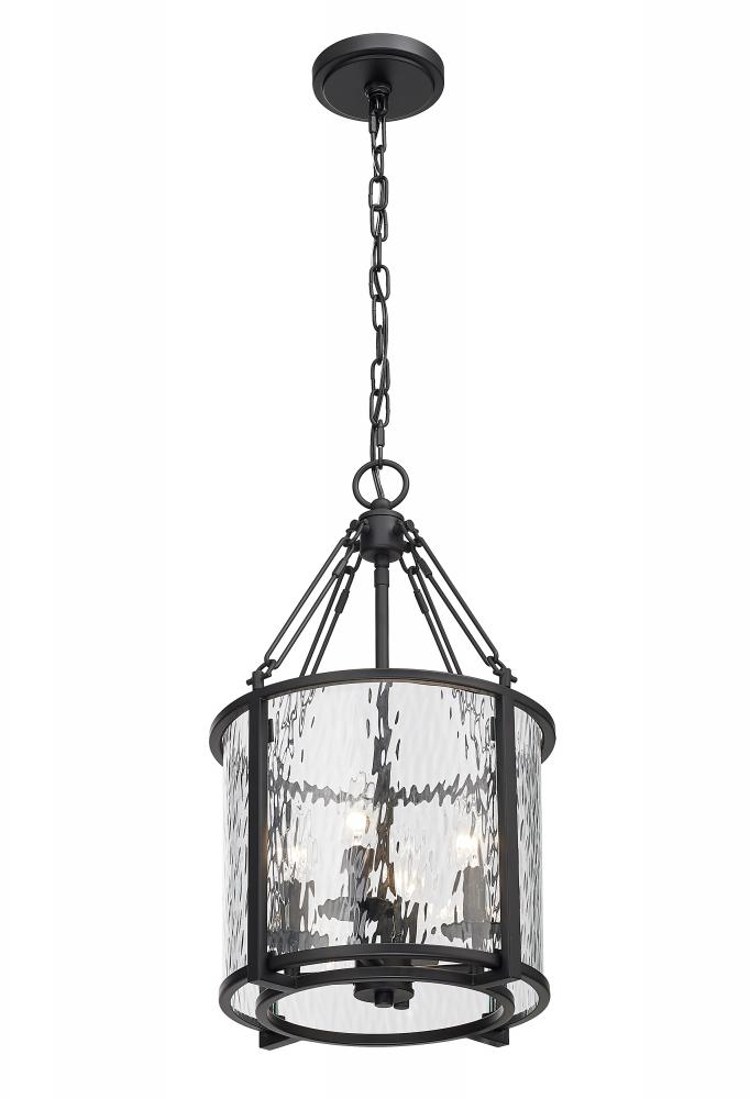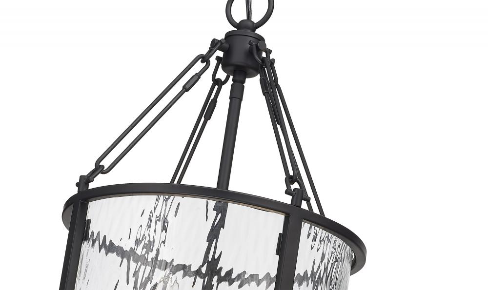 The bold scale of the Barrington series is perfectly proportioned to fit a variety of large spaces. The handsome steel cage in a Matte Black finish, along with the movement of its waterglass shade, adds distinction without competing with other elements in