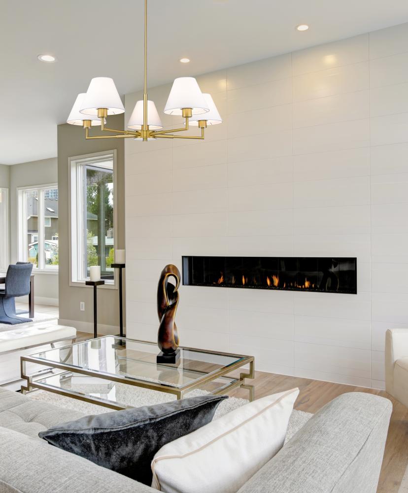 Modern flexibility of design plays up the chic, understated character of a five-light chandelier. Expertly designed with simplicity at the forefront, the chandelier pairs a rich luxe gold frame with straight suspension and complementary angularity, all capped with conical shades that create the perfect hint of dimensionality for a fixture that looks great everywhere from the dining room to a bedroom dressing area.