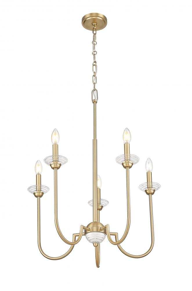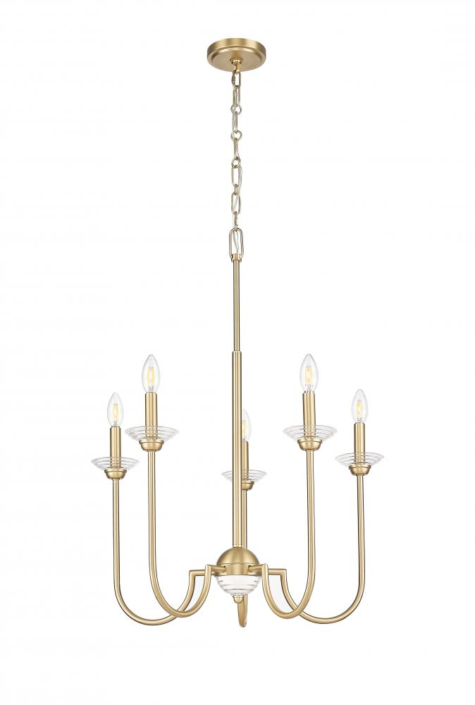 Vintage style resonated beautifully in every detail of this transitional five-light chandelier. Floral bobeches, in both white metal and clear glass, add charming presence in a kitchen, living area, or bedroom, while a modern gold finish adds sophisticated but approachable warmth and character.