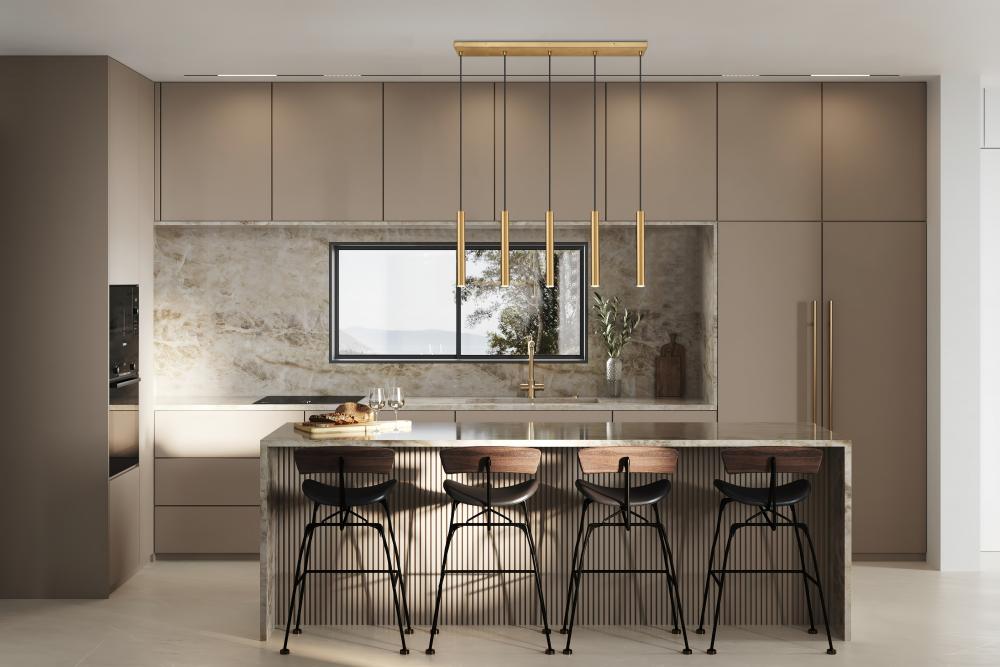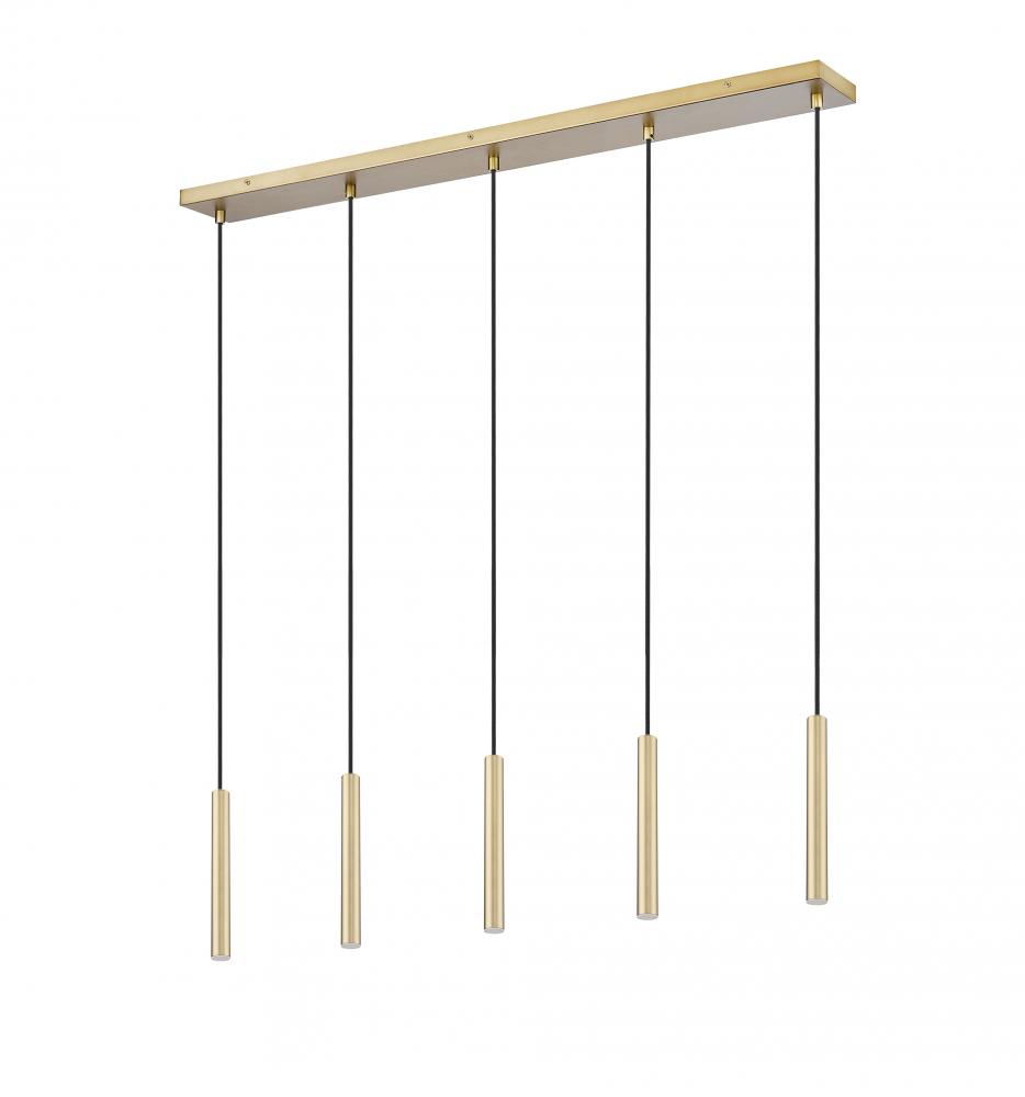 Embrace warm sophistication with a modern five-light linear chandelier from the Forest collection. Its a streamlined silhouette with a slender canopy and slim housings, all in a lovely warm modern gold finish over steel construction. Integrated LED lights are energy efficient and dimmable, perfect for a contemporary kitchen or dining room.