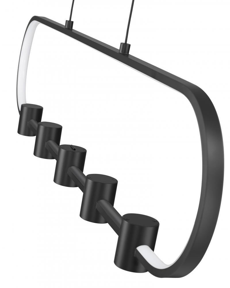 Islands and other horizontal spaces welcome the reach and silhouette of this five-light LED linear chandelier, a playful fixture style with refining shape. An oval matte black aluminum open metalwork body with multiple cylinder shades twist the conventional style of a fixture, giving it a home in casual spaces. LED lighting is dimmable, creating custom levels of illumination to suit desires through the day and night.