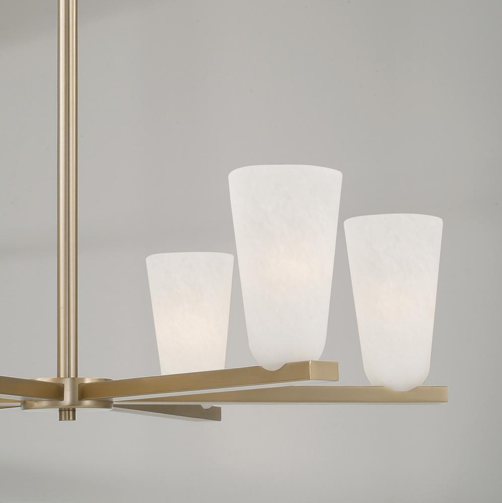 The Romy Chandelier delivers transitional style with modern appeal. In elongated tapered shades curved at the base, the Faux Alabaster glass gives a soft ambient glow. Finished in Matte Brass, this luminaire brings effortless sophistication to any space.