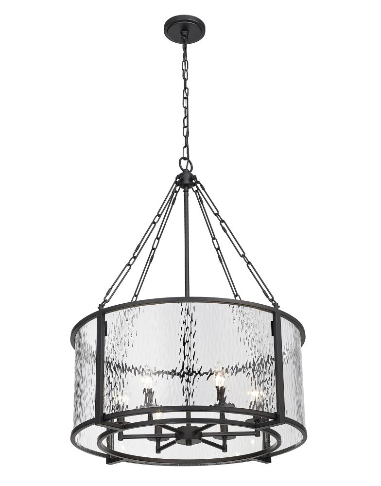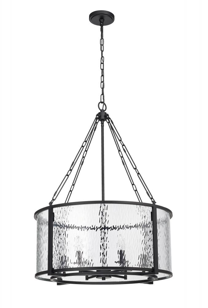 The bold scale of the Barrington series is perfectly proportioned to fit a variety of large spaces. The handsome steel cage in a Matte Black finish, along with the movement of its waterglass shade, adds distinction without competing with other elements in