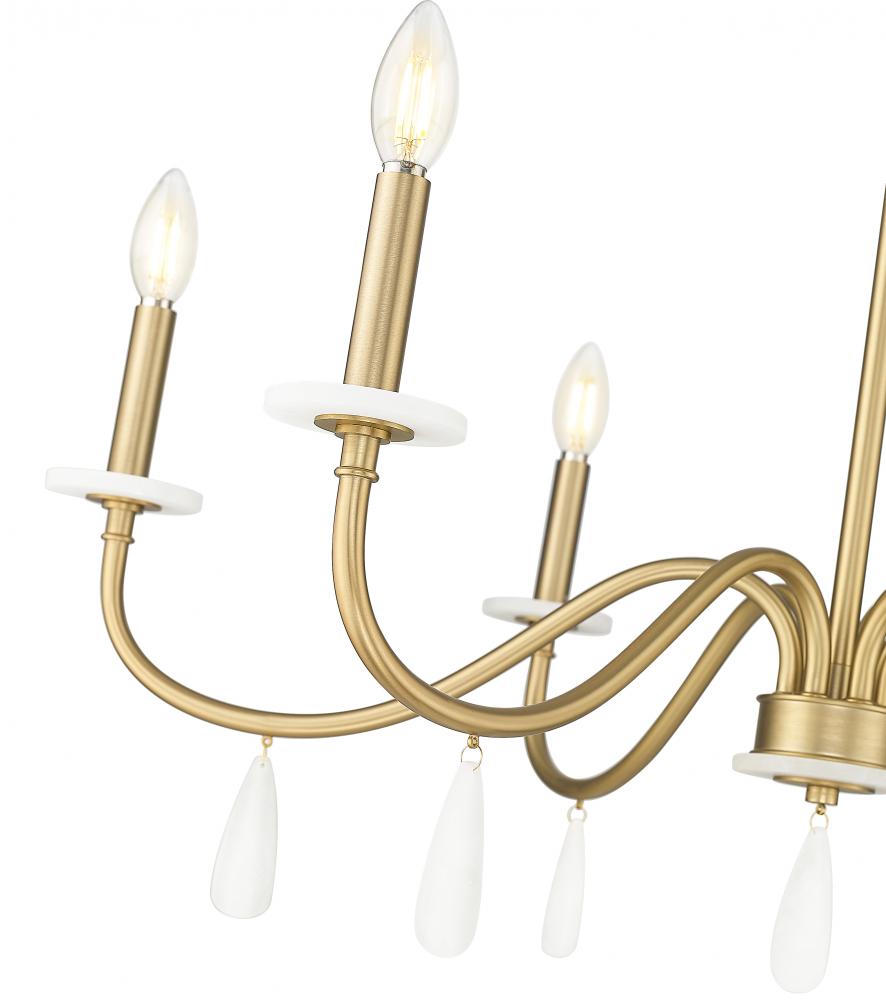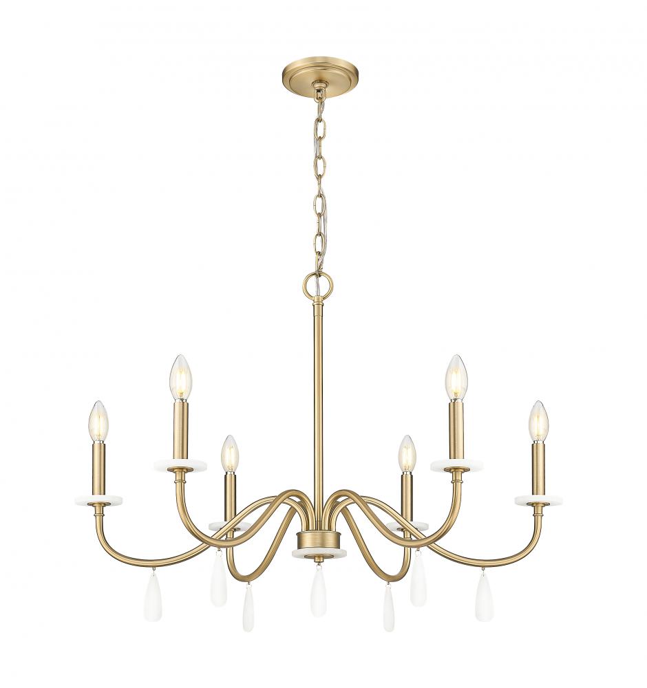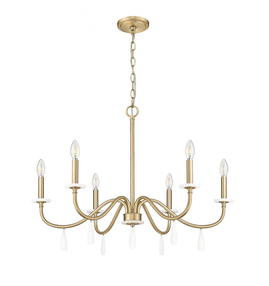 Modern gold finish steel creates a warm and inviting aesthetic for this chic six-light chandelier, a superb choice for highlighting dining ensembles, living rooms, and foyers. Symmetry offers a hint of glam to a fixture with gently curved arms holding torch sleeves and charming alabaster boboches. Catch dimmable light with ornate droplets putting finishing touches on a timeless light fixture.