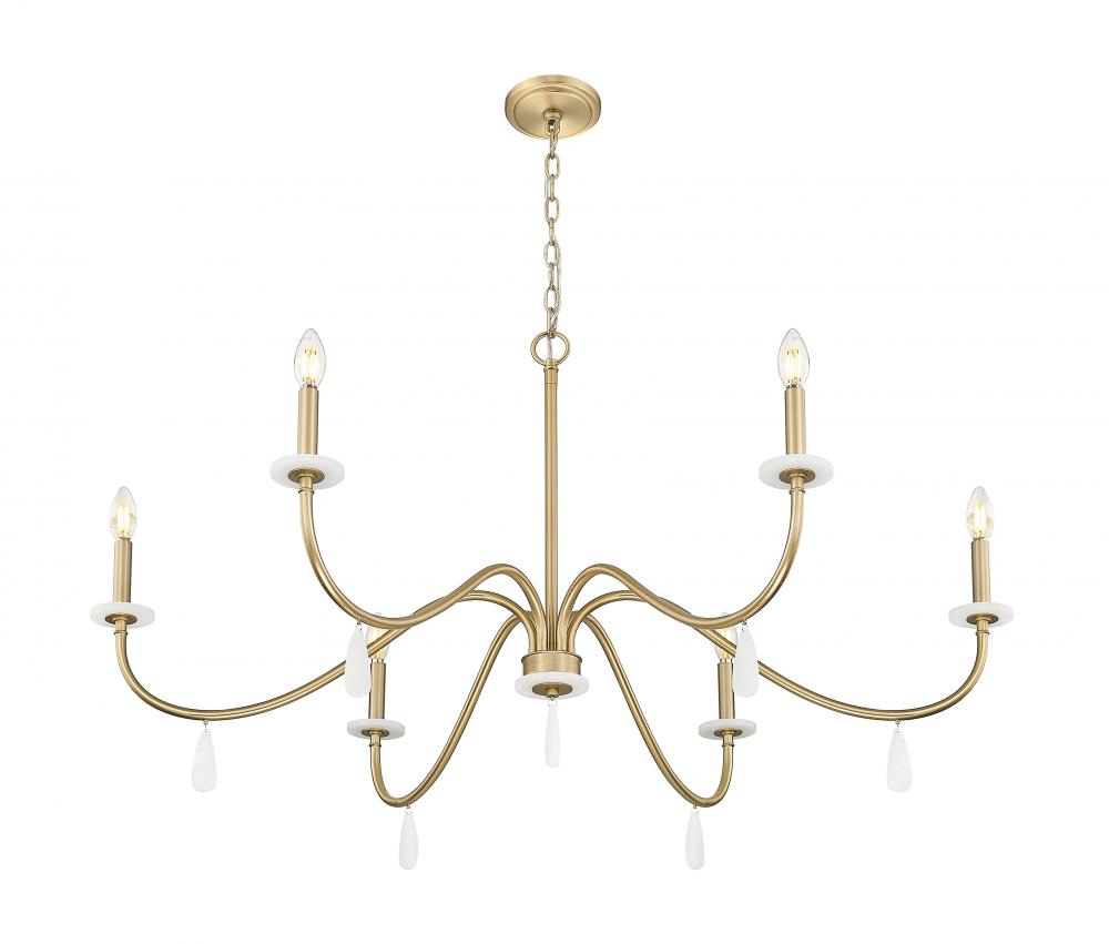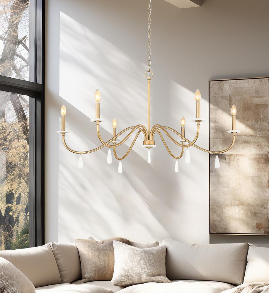 Sweeping curves create optically pleasing arms in a six-light chandelier with timeless, elegant style. This modern gold finish steel fixture is a beautiful choice for lighting dining rooms, living rooms, and entryways, with decorative alabaster boboches and suspended droplets embellishing its motif. This light offers dimmable illumination levels to match moods and adjust to needs.