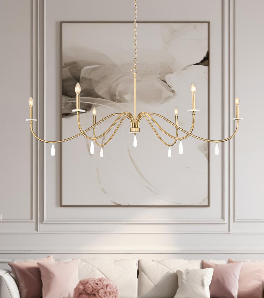 Affix your eyes on gracefully curved arms that make a statement in this six-light chandelier, an exceptional choice for blending sophistication and elegance. Dining rooms, living rooms, and foyers take on a new life when illuminated with this modern gold finish steel fixture with smooth torch-style holders atop alabaster bobeches, and dangling artisan elements showing off below. Dimmable features make mood lighting an essential part of this beautiful light fixture.