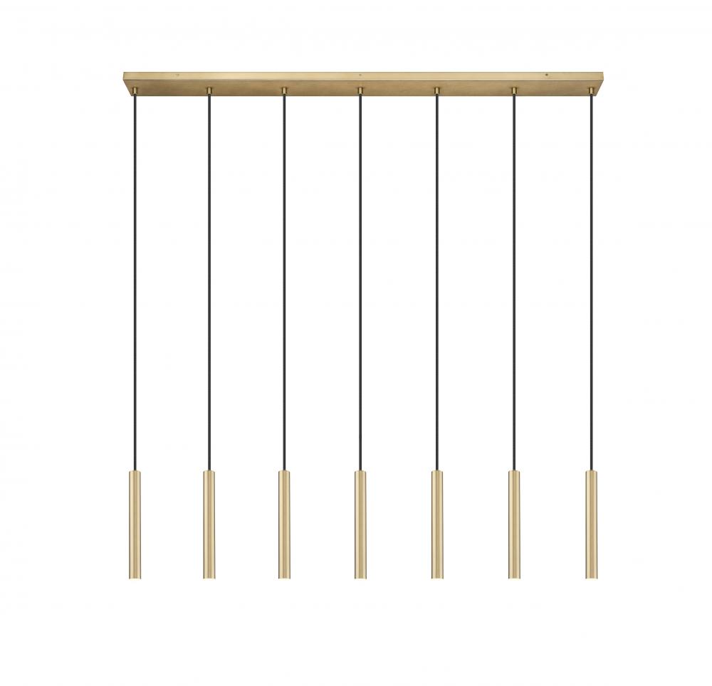 A modern gold finish sets a refined, inviting tone for this contemporary seven-light linear chandelier. Featuring energy efficient LED lights in slim housings, this minimalist design is ideal over a kitchen island or dining table, delivering both sophisticated style and dimmable illumination.
