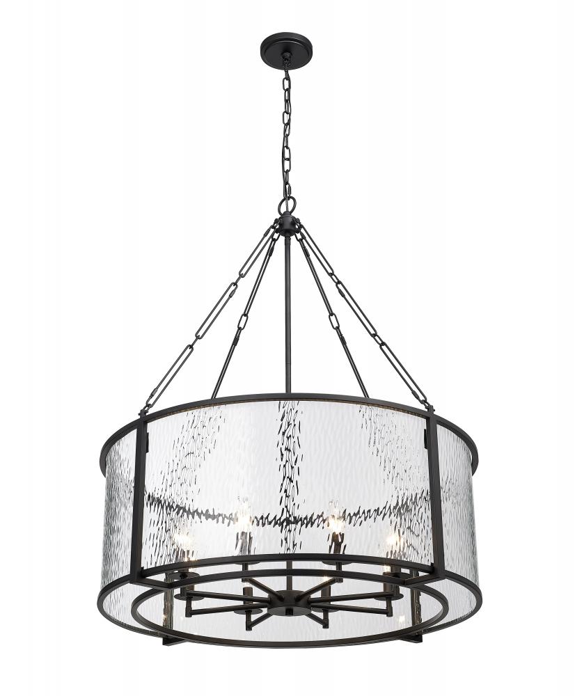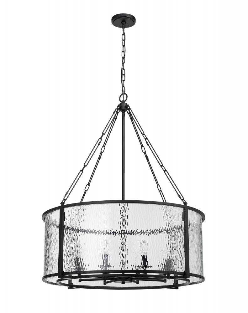 A grand scale and tempting circular silhouette begin a journey to dramatic design elements as this striking light fixture becomes a mainstay in dining spaces, foyers, and living areas. This eight-light pendant from the Barrington collection is styled around an enticing energy and an industrial motif with a round cage made of matte black finish steel framing romantic clear waterglass that distorts a view of candelabra bulbs creating a castle-inspired look. Removable chain links and rod allow for a reduction in fixture height to 27.75 if desired.