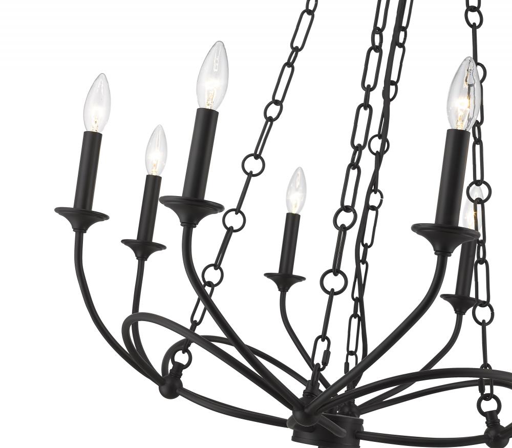 Capture a theatrical motif with artistry and romance worthy of a custom space with an eight-light chandelier leaving a lasting impact. From the Arabella Collection, this exquisite fixture maintains a flowery symmetrical motif in spite of its bold matte black finish steel construction. A ribbon-like design accents its chicly arched frame with charming candelabra bulb mounts that soften edgy character.
