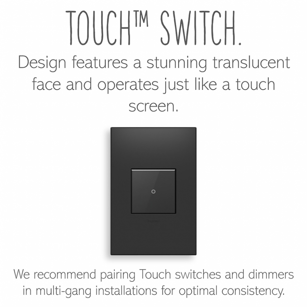 Perfect for anywhere you'd like to upgrade a standard switch with sleek, intuitive touchscreen technology. This stylishly minimalist modern light switch functions just like your smartphone's touch screen - simply touch your finger to turn lights on and off. Use this device on its own to control a light or fixture from a single location, or pair with a second switch to control a single light source from two locations (3-way control).This switch* features enduring Microban? antimicrobial technology that works to reduce the growth of bacteria, around the clock, for the lifespan of the product.* Existing inventory of switches, dimmers and plastic wall plates from the adorne? Collection at some partner locations may not yet include Microban? protection. To confirm that a specific Legrand product is protected with Microban?, check that the exterior of the product packaging includes a green dot or a ""Protected with Microban"" label.Made exclusively for use with screwless Wall Plates from the adorne? Collection, sold separately.No antimicrobial efficacy claims are being made or are valid with respect to products sold in Canada.