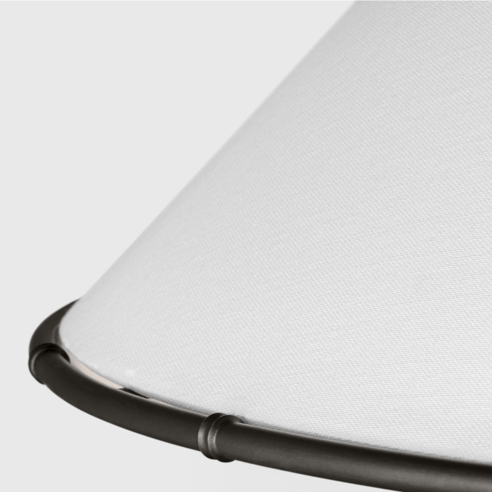 Crafted with Steel in a Aged Iron finish with silk screen white inside clear outside glass diffuser and white linen fabric shade