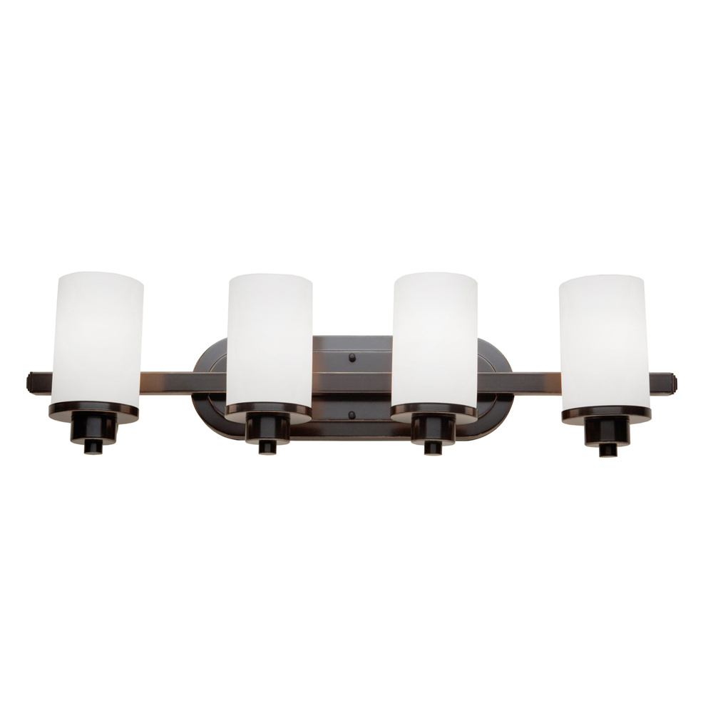 Parkdale 4 light bathroom vanity features its clean and simple design complimented with opal white glassware in rubbed oiled bronze finish