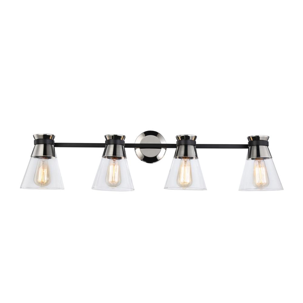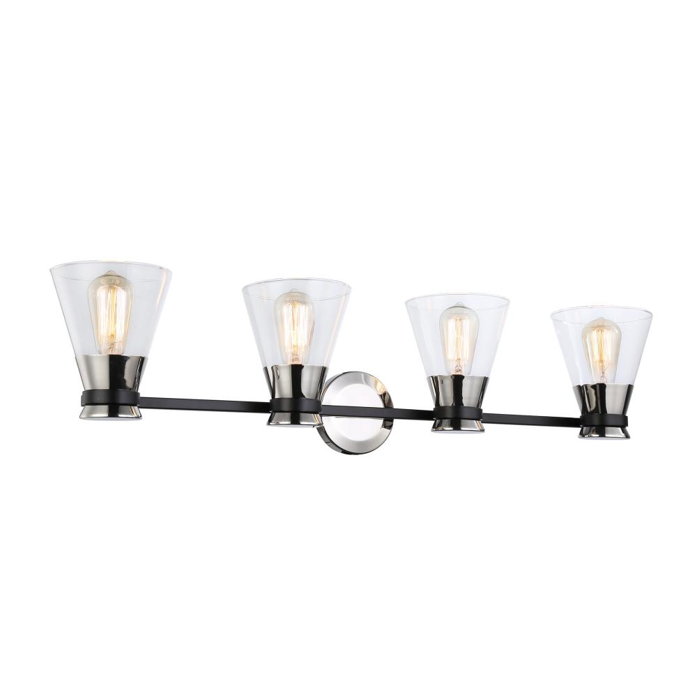 The Kanata collection by designer Kevin Kraemer is unique, stylish and soft. This collection features clear tapered glassware that is held by thin arms that wrap around the cups to finish off the design. The polished nickel cups are complimented with a smooth black finish on the arm banding. 4 light version shown - single and three light versions also available. (Alternate colour option available - Black and brass)