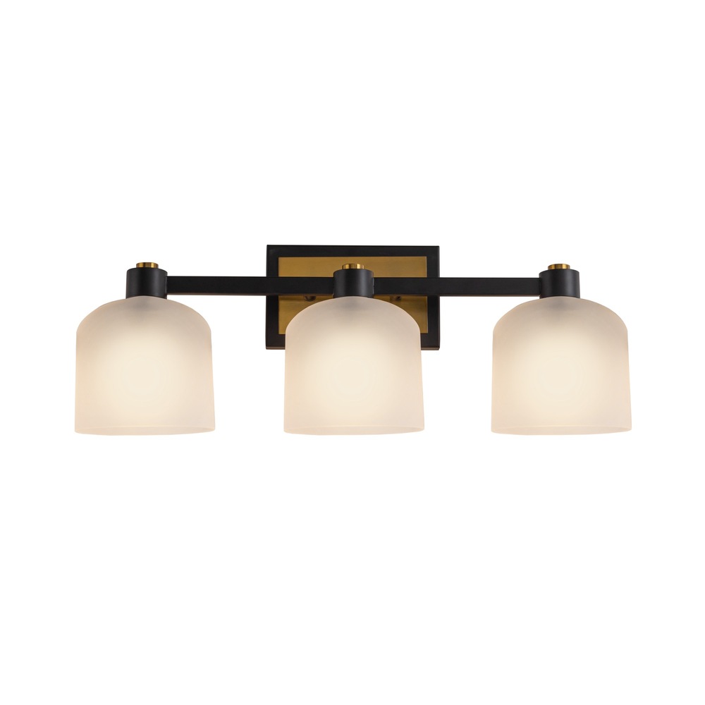 The Lyndon vanity collection easily combines modern elegance with timeless design. This collection features oval shaped acid white glassware delicately set upon a black frame with brushed brass accents. The brushed brass accents accentuate the collection, adding a touch of warmth. A very stylish look for any bathroom space. From the Lighting Pulse design firm. 3 light wall sconce shown (available in a single and 4 light models)