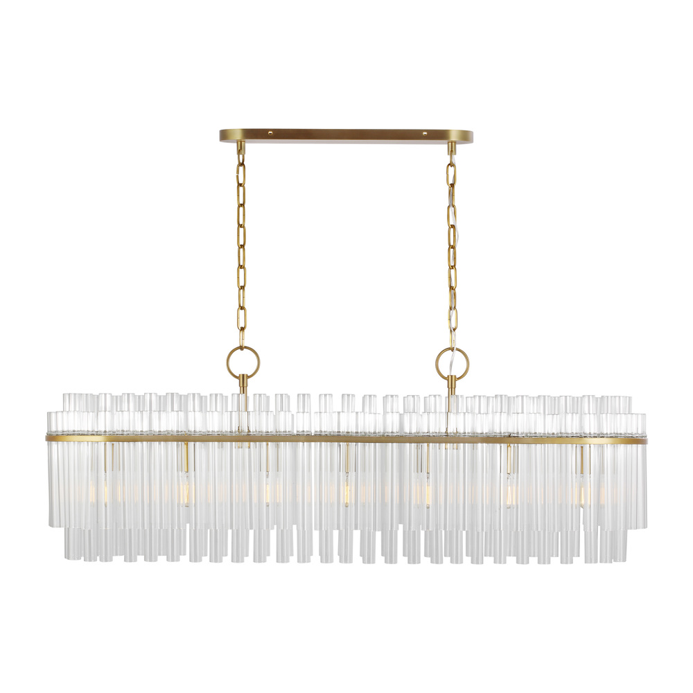 The Beckett family from Chapman & Myers presents Art Deco forms with a modern minimalist sensibility. Crafted of steel, a round metal band holds the clear extruded glass cylinders in place. The Beckett twelve light single-tier chandelier in burnished brass is the perfect way to achieve your home's desired fashion or functional needs.