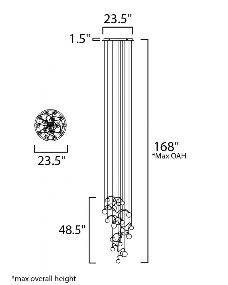 Numerous spheres of heavy Bubble Glass are suspended in an avant-garde fashion connected at various points with a contrasting red cord that creates an artistic impression of light. The Polished Chrome canopy reflects light from the integrated LED in a g