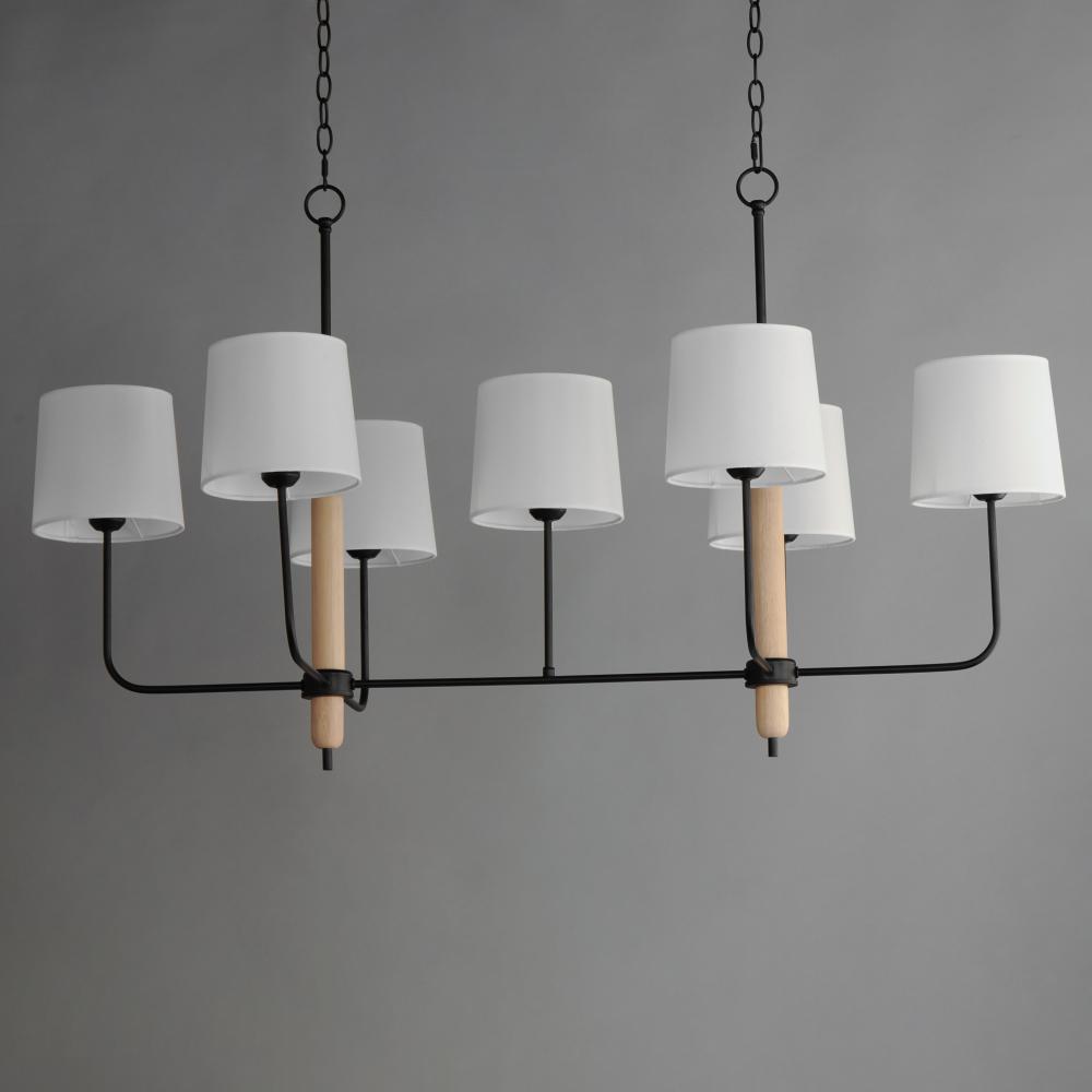 Natural White Oak wood details are featured plainly on a slim Matte Black metal frame. Oversized off-white linen shades cover sockets for a minimalist and natural look. Available in multiple configurations of chandelier and a wall sconce.