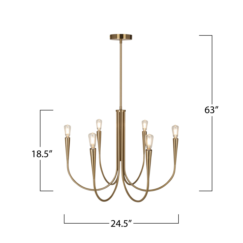 The Bronte Collection chandelier presents a classic design with tapered arms, accentuated by a warm brushed brass frame that exudes a touch of modern sophistication. 6 lite 25.5" diameter chandelier shown. (Also available in a semi-gloss black finish)